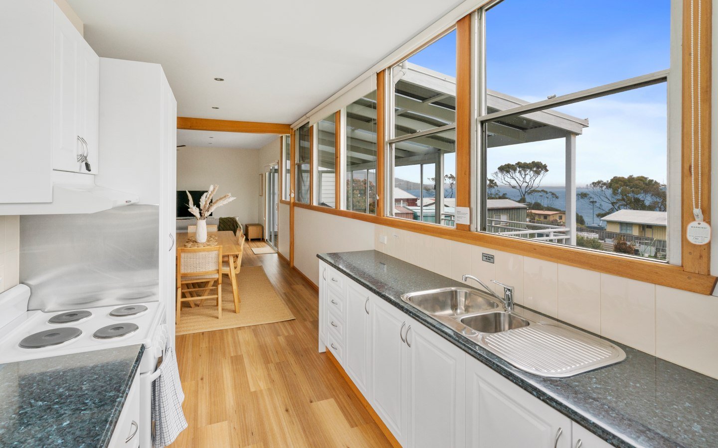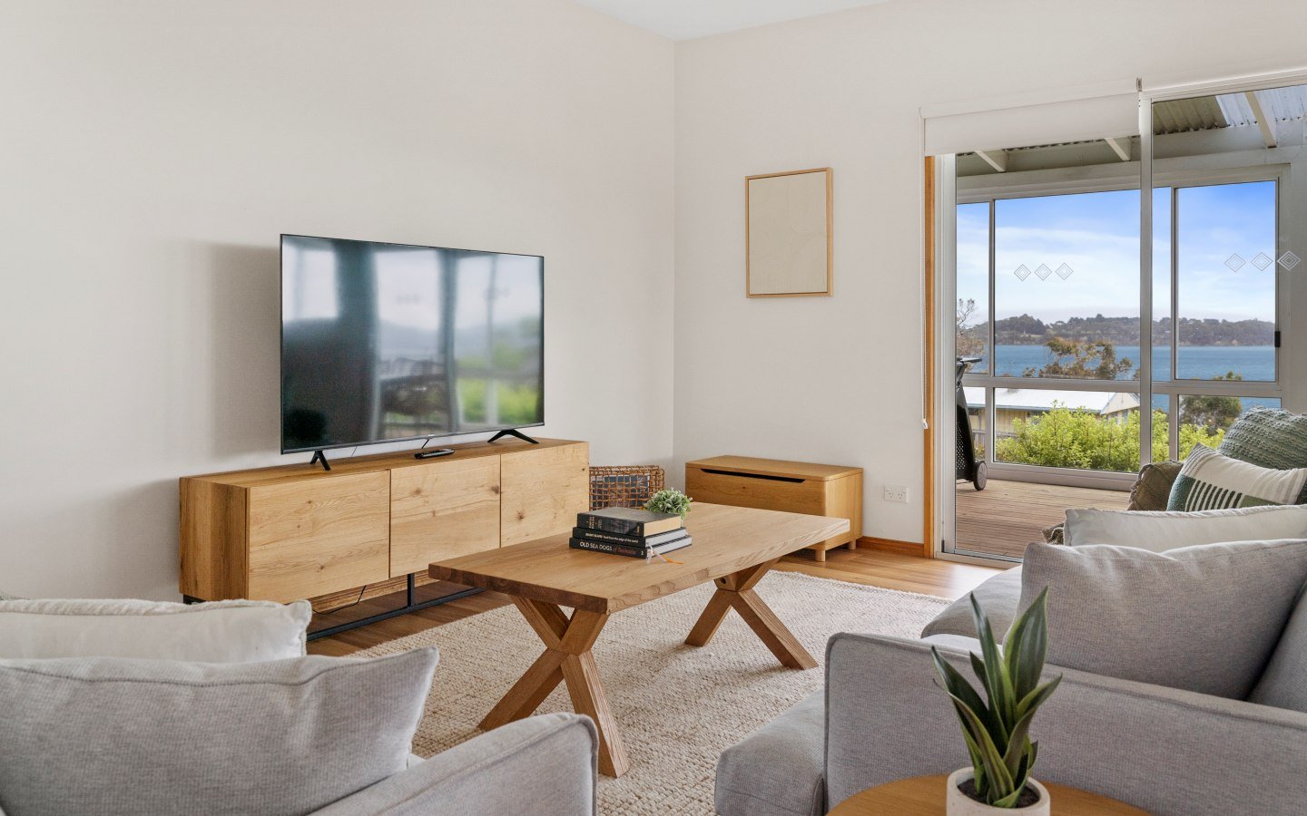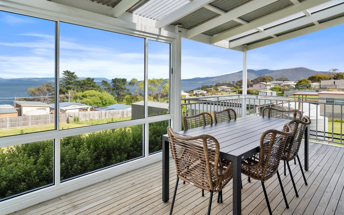 The cottage comfortably sleeps up to 6 people; two bedrooms are equipped with queen-sized beds, and the third bedroom is equipped with two single-sized beds. The living space is a spacious area with a well-appointed kitchen and a comfortable lounge and dining area. The living room opens onto a semi-closed deck/verandah with 180° views of the Channel and across Gordon Bay and Satelite Island.