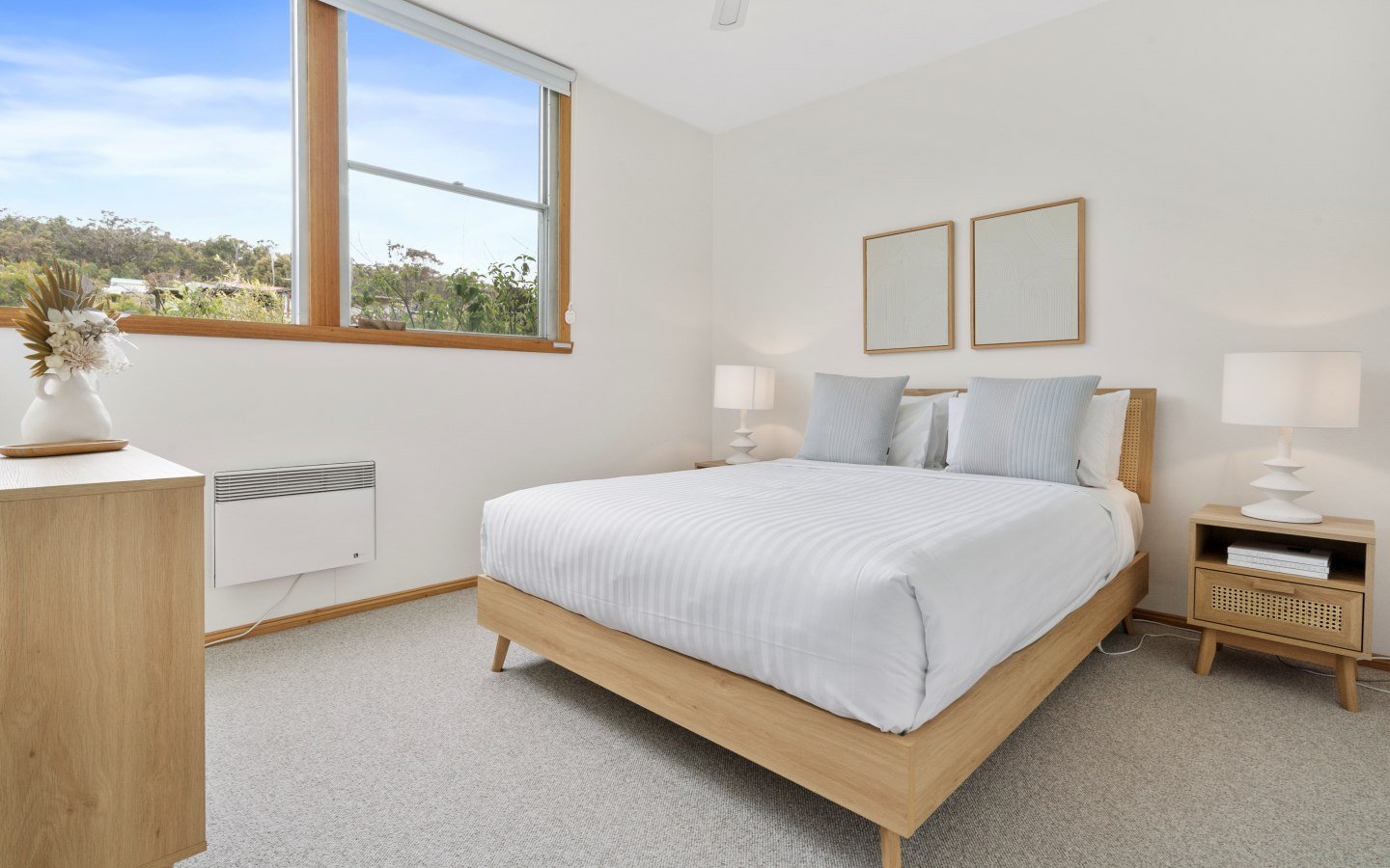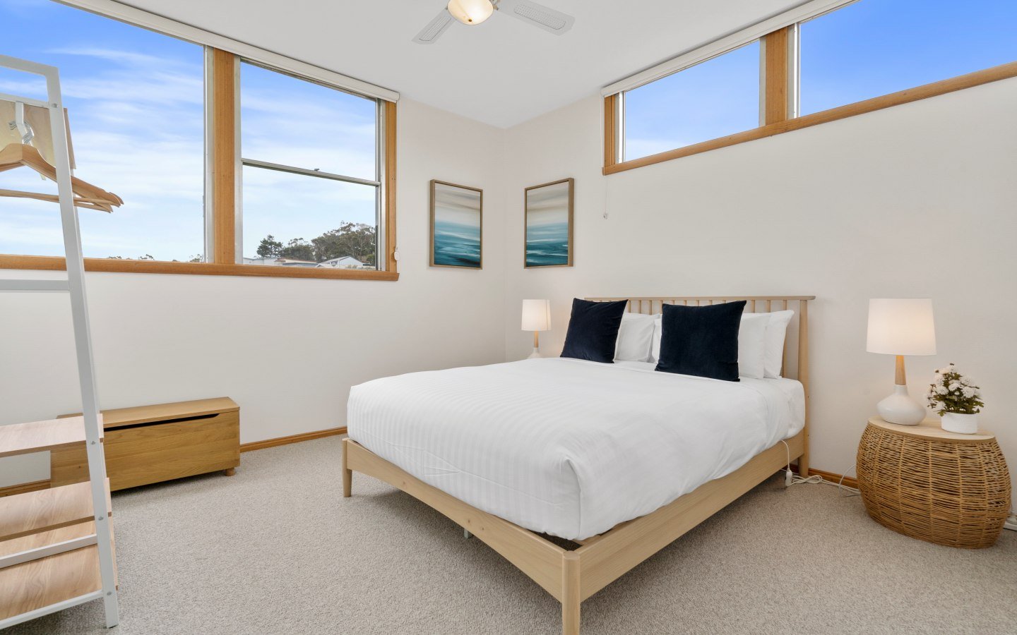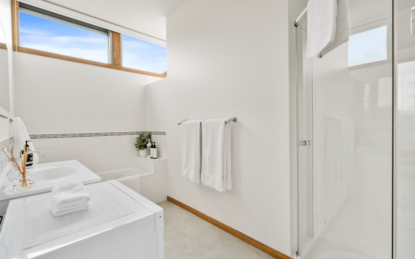 Each bedroom is complete with fresh linen, doonas, extra blankets, side tables, and storage. The bathroom features a bathtub and a separate shower, premium quality towels, body wash, shampoo, and conditioner.
