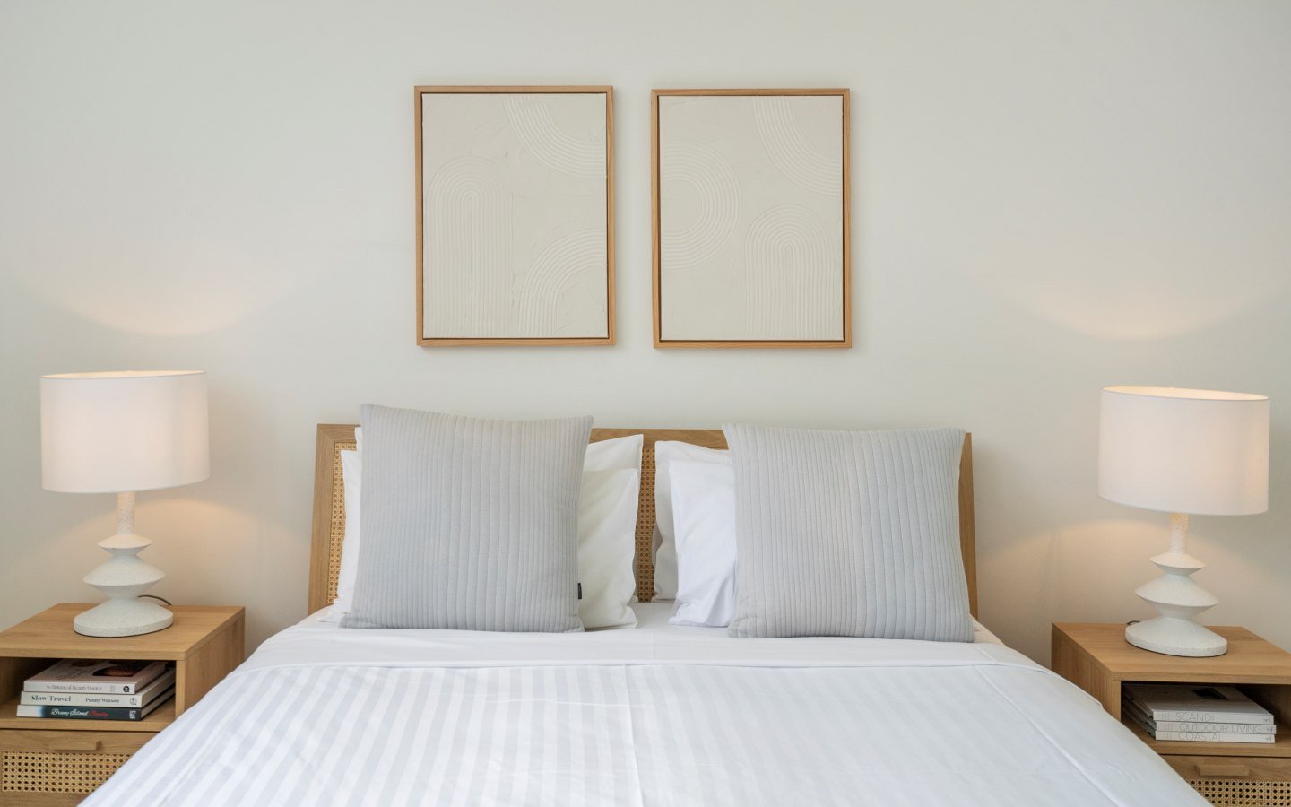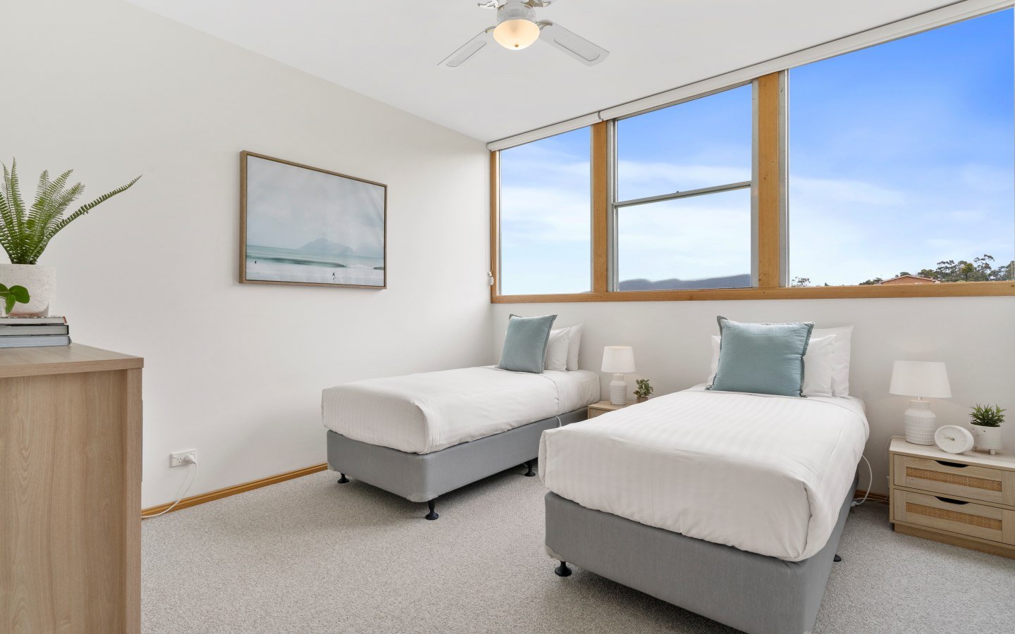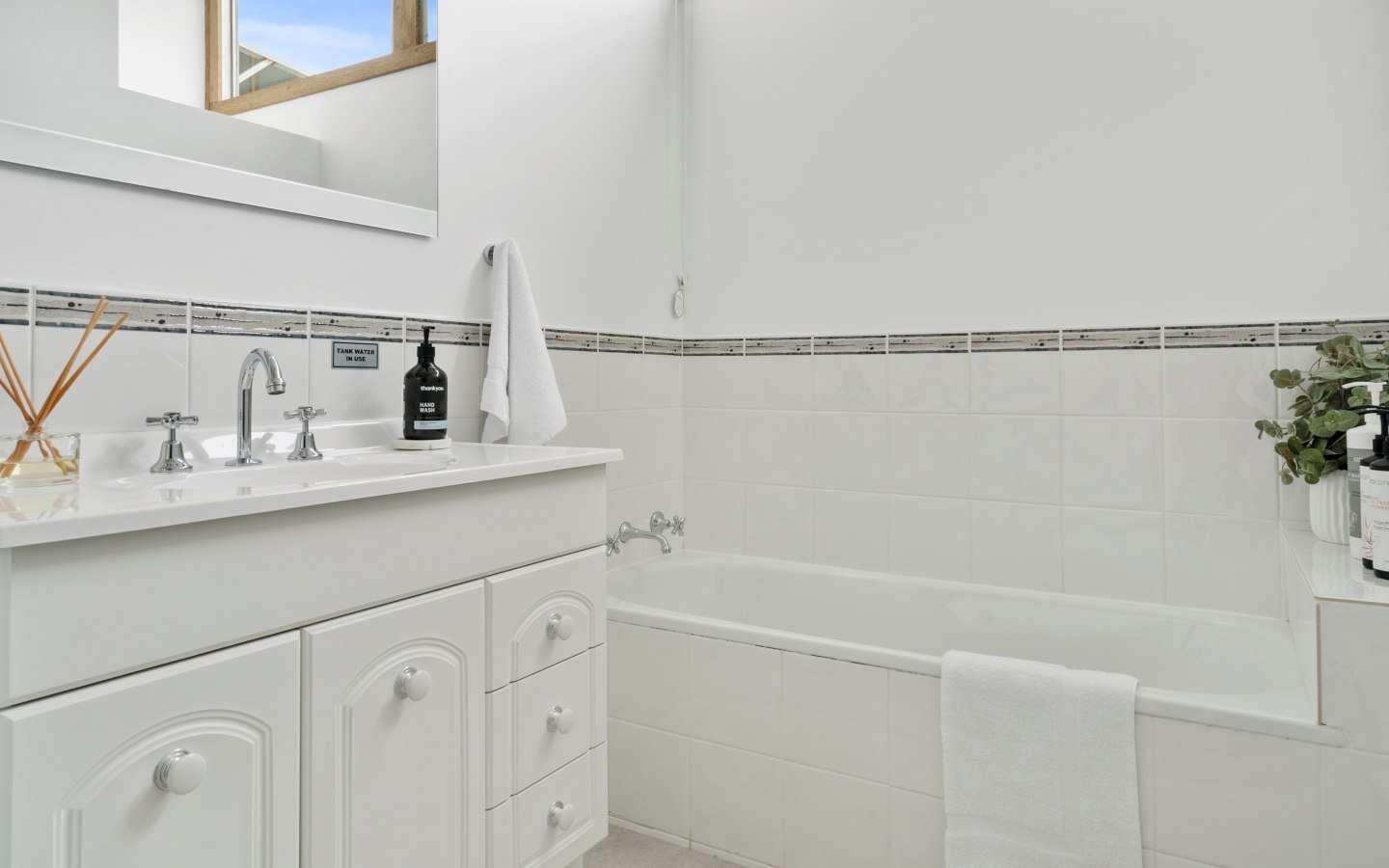 Each bedroom is complete with fresh linen, doonas, extra blankets, side tables, and storage. The bathroom features a bathtub and a separate shower, premium quality towels, body wash, shampoo, and conditioner.